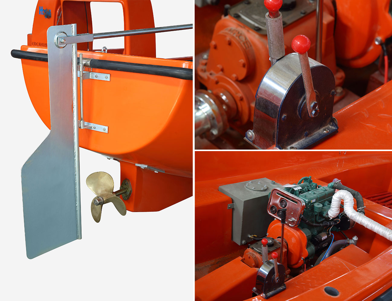 本艇的設(shè)計、制造和試驗完全符合MSC.226(82)、MSC.274(85)、MSC.321(89)和MSC.323(89)修正的MSC.81(70)《經(jīng)修正的就生設(shè)備試驗建議》第1部分;1974年國際海上人命安全公約及其修正案第Ⅲ章第21、31、34條;經(jīng)MSC.218(82)、MSC.272(85)、MSC.320(89)修正的MSC.48(66)《國際救生設(shè)備規(guī)則》第Ⅴ章的要求; 艇體為阻燃型玻璃鋼;供人員行走的表面均為防滑面;內(nèi)殼與外殼的聚氨酯泡沫給救助艇提供足夠的浮力。如果在水線下面的船體有損壞,浮體仍可提供足夠的浮力使艇在安全水平面上漂浮。救助艇兩側(cè)設(shè)有鋼性扶手以便乘員上下,自滔式甲板確保進入艇內(nèi)的海水快速排放;艇上裝有手搖泵,用于排除艇內(nèi)積水;艇上裝有不銹鋼吊鉤系統(tǒng),采用吊艇索下放或回收;救助艇配備自扶正空氣箱,滿足客貨滾裝輪的使用要求;本艇可滿載全速航行大于4小時,航速可達到6節(jié)以上。